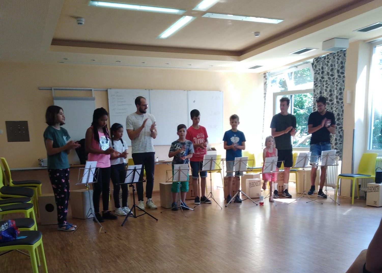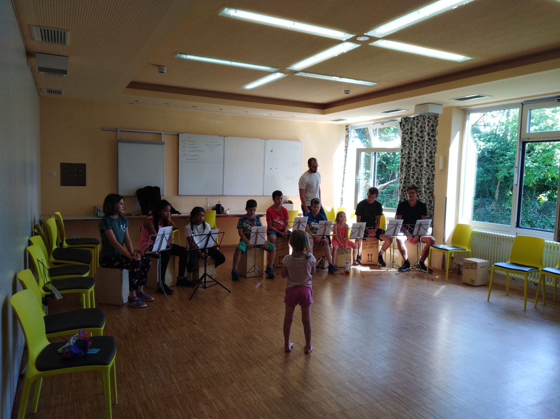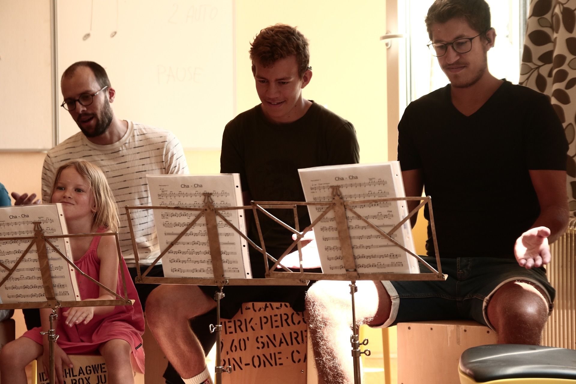 Am Samstag hieß es zeitig aufstehen, um nach dem Frühstück zum ersten Workshop startklar zu sein: Tom Raule, Musikschullehrer an der Jugendmusikschule Wangen, wartete schon auf unsere Kinder und Jugendlichen, um in den folgenden zwei Stunden ein kleines Konzert einzustudieren. So hatten wir Eltern parallel die Gelegenheit, uns ohne Kinder zu unterhalten – denn auch Gespräche unter Eltern sind wichtig! Themen waren z. B. der Sonderpädagogische Dienst, Nachteilsausgleich, aber auch generell der Umgang unserer Kinder und ihrer Freunde mit ihrer Hörbehinderung. Nach knapp zwei Stunden wurden wir dann eingeladen zum Konzert – und unsere Erwartungen waren weit übertroffen: zwei Stücke auf der Cajon wurden zum Besten gegeben, und es ist doch beeindruckend, was man bereits auch schon nach so kurzer Zeit einstudieren kann! Die begeisterten Eltern forderten eine Zugabe – und bekamen sie auch: die jungen Leute hatten nicht nur auf der Cajon geübt, sondern auch gelernt, mit ihrem Körper Musik zu machen – so etwas nennt man Body Percussion. Mit einem kleinen Präsent verabschiedeten wir Tom Raule.